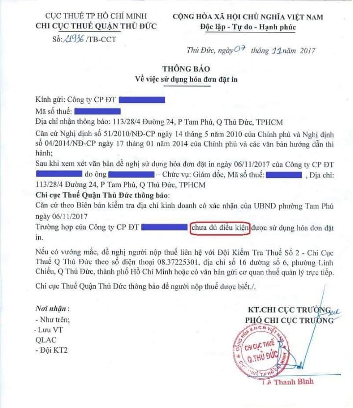 Sau khi kiểm tra hồ sơ và xem xét tình hình hoạt động thực tế của Công ty, Cơ quan Thuế sẽ ra Thông báo theo Mẫu số 3.15 Phụ lục 03 ban hành kèm theo Thông tư 37/2017/TT-BTC về việc Doanh nghiệp đủ điều kiện hay không đủ điều kiện đặt in hóa đơn.