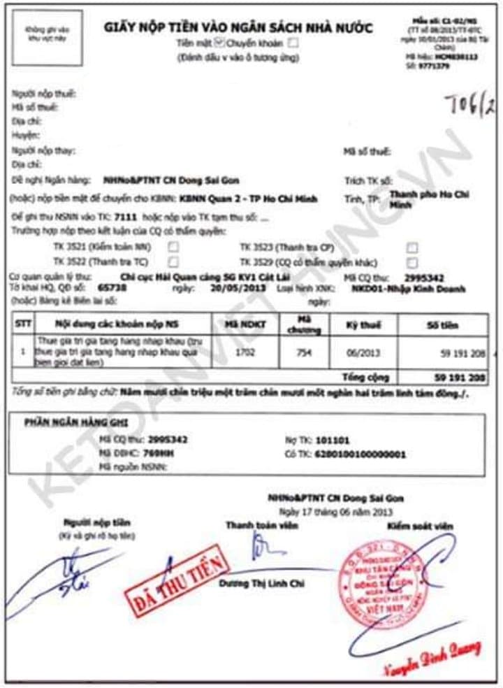 Mẫu giấy nộp tiền vào ngân sách, tờ khai hải quan