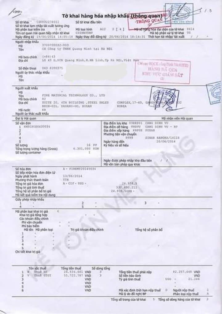 – Tờ khai hải quan nhập khẩu, hợp đồng …