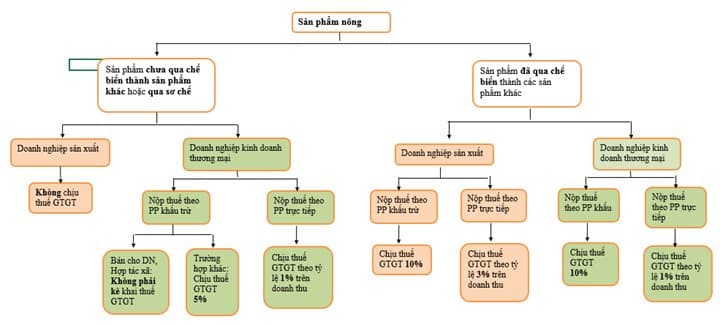 Trường hợp doanh nghiệp, hợp tác xã nộp thuế GTGT theo phương pháp khấu trừ bán sản phẩm trồng trọt, chăn nuôi, thủy sản chưa chế biến thành các sản phẩm khác hoặc chỉ qua sơ chế thông thường cho các đối tượng khác như hộ, cá nhân kinh doanh và các tổ chức, cá nhân khác thì phải kê khai, tính nộp thuế GTGT theo mức thuế suất 5%