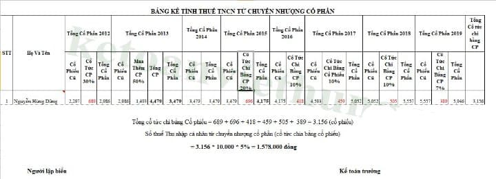 - Bước 1: Lập bảng excel xác định số cổ phiếu trả bằng cổ tức và tính ra số thuế thu nhập cá nhân phải nộp