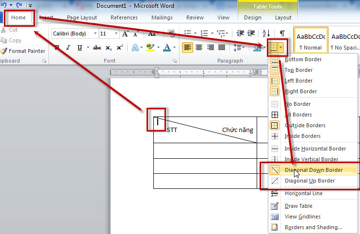 Ngoài ra để tách 1 ô thành 2 ô có chứa đường chéo kẻ giữa 2 ô thì các bạn đặt trỏ chuột vào ô đó và click tab Home --> Chọn biểu tượng Border như hình phía dưới và chọn biểu tượng hình chéo.