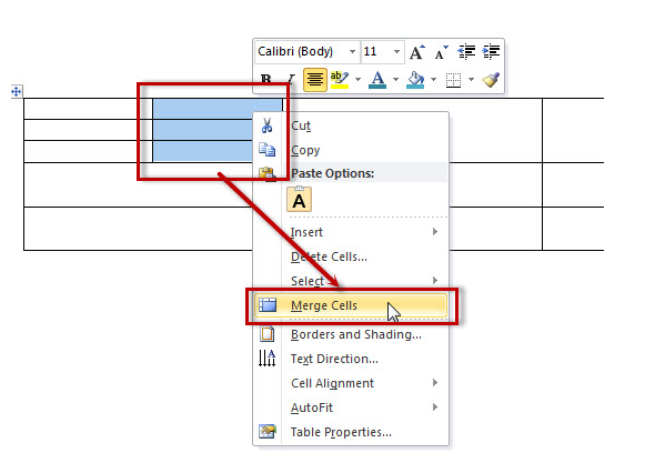 Trong word thì các bạn có thể gộp 2 hoặc nhiều ô cùng lúc lại với nhau thành 1 bằng cách bôi đen các ô muốn gộp click chuột phải và chọn Merge Cells như hình phía dưới