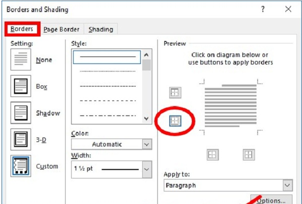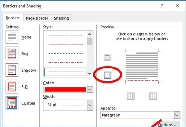 Xuất hiện Borders and Shading các bạn chọn thẻ Borders và nhấn chọn vào biểu tượng đường viền dưới để bỏ chọn đường viền dưới và nhấn OK.