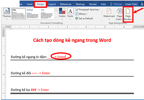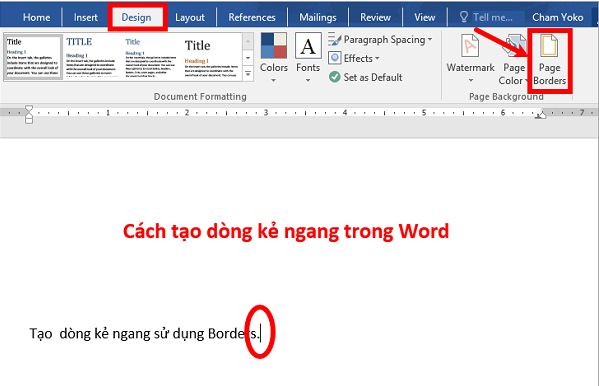 Bước 1: Đặt con trỏ chuột vào dòng mà bạn muốn tạo dòng kẻ ngang phía dưới. Tiếp theo chọn thẻ Design -> Page Borders.