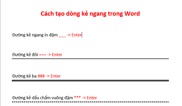 Các bạn có thể sử dụng các biểu tượng sau đó nhấn Enter để tạo những đường kẻ ngang tùy ý trong Word.