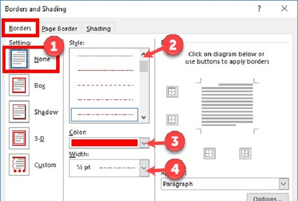 Bước 2: Xuất hiện Borders and Shading các bạn chọn thẻ Borders, trong phần Setting các bạn chọn None (1), tiếp theo chọn kiểu kẻ ngang trong phần Style (2), chọn màu sắc trong phần Color (3), độ dày của của đường kẻ ngang trong phần Width (4).